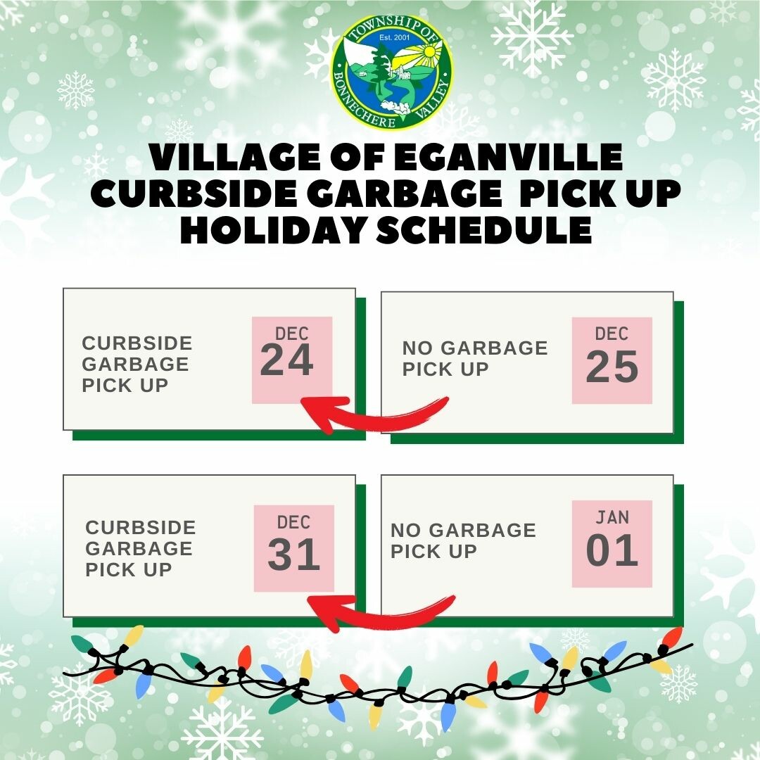 Recycling and Garbage pick up occurs weekly. NOTE: The change for curbside garbage collection for the Christmas Holidays. No pickup will occur on December 25th or January 1st. They will be collected on December 24 & December 31.
