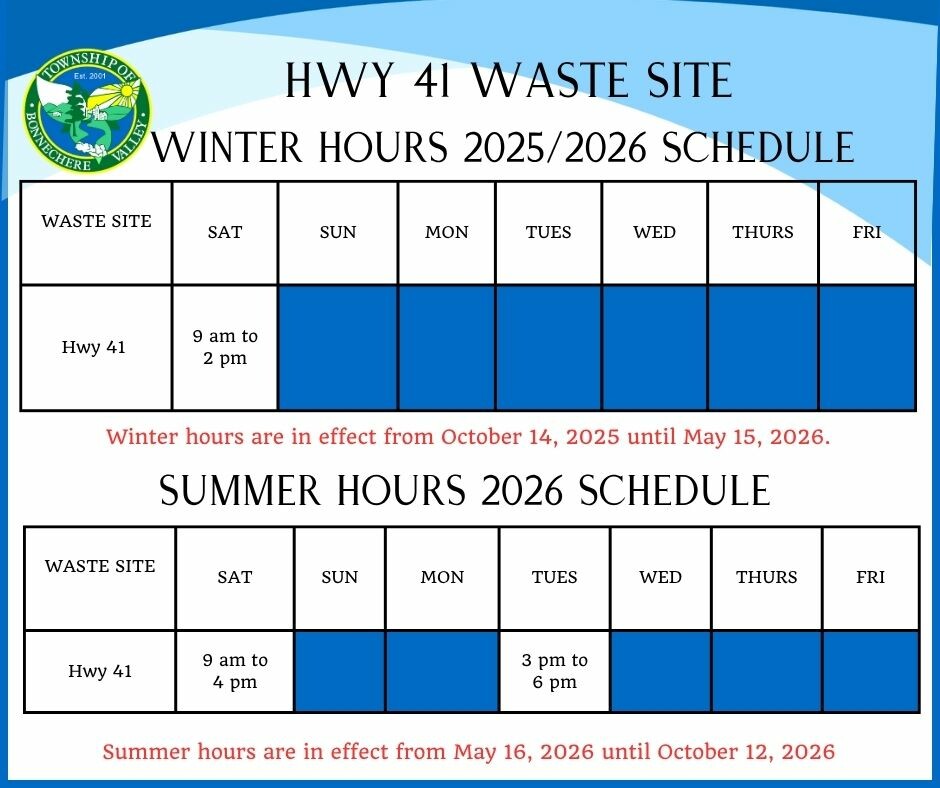 The Hwy 41 Waste Site is located at 1002 Larmond Road. The hours of operation vary between the Summer and Winter Hours. Please refer to the Hours of Operation schedule for days and times.