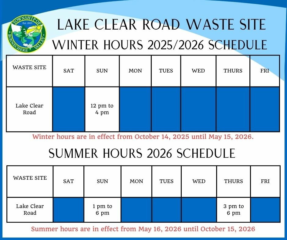 The Lake Clear Waste Site is located at 3091 Foymount Road. The hours of operation vary between the Summer and Winter Hours. Please refer to the Hours of Operation schedule for days and times.