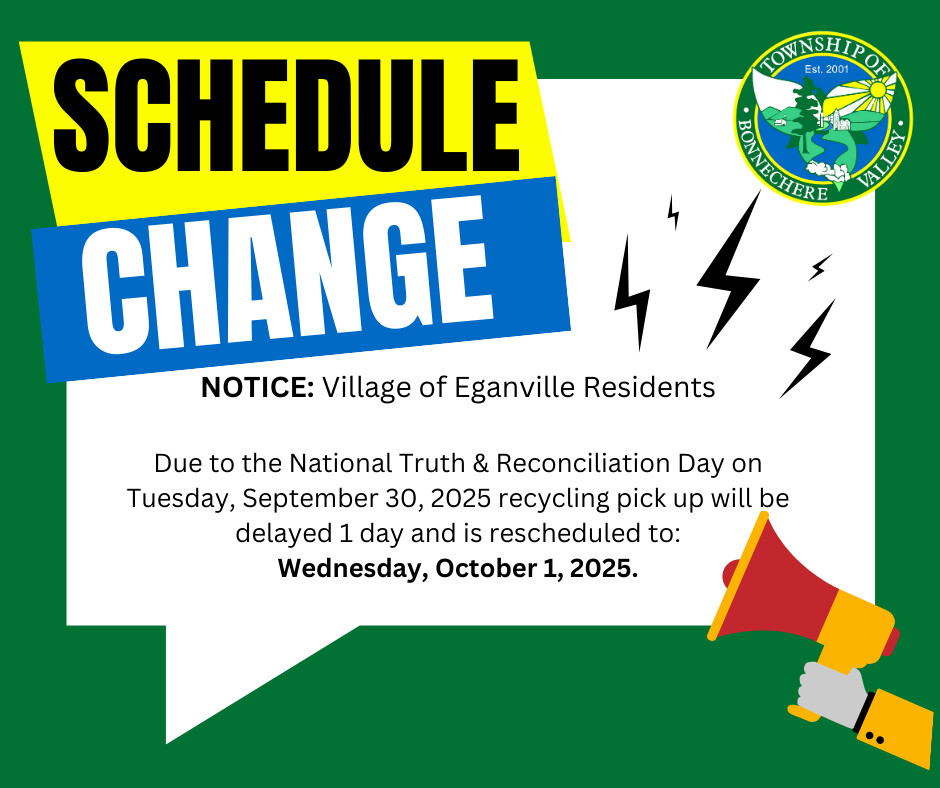 The Village of Eganville Recycling Calendar is a helpful tool to determine which recycling material is being collected during a given week and identifies other waste management related dates. Recycling and Garbage pick up occur weekly. Reycling pickup is on Tuesdays and Garbage pickup is on Thursdays. Please have both recycling and garbage placed at the curb by 7 am on their respective days.