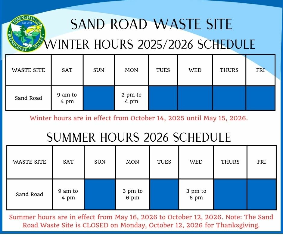 The Sand Road Waste Site is also home to the Household Hazardous Waste Depot. The depot is only open on Saturdays and is typically open the Saturday of the long weekend in May and closes the last Saturday in September. For more information pertaining to the hours of operation and items accepted at the Hazardous Waste Depot, please visit the Household Hazardous Waste Depot section of our website.