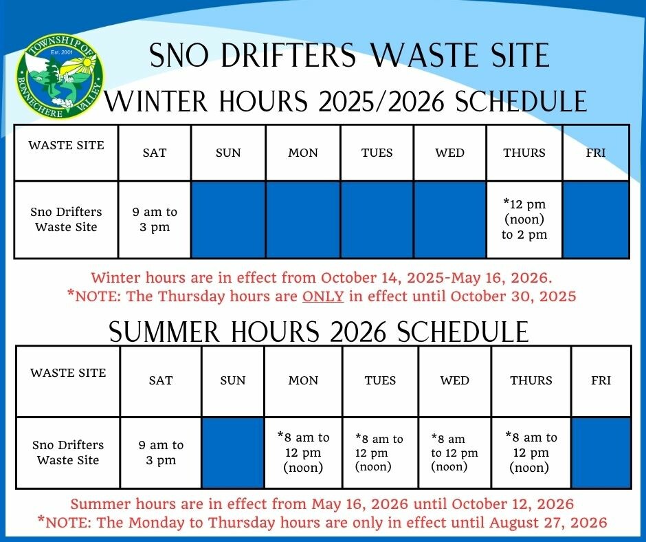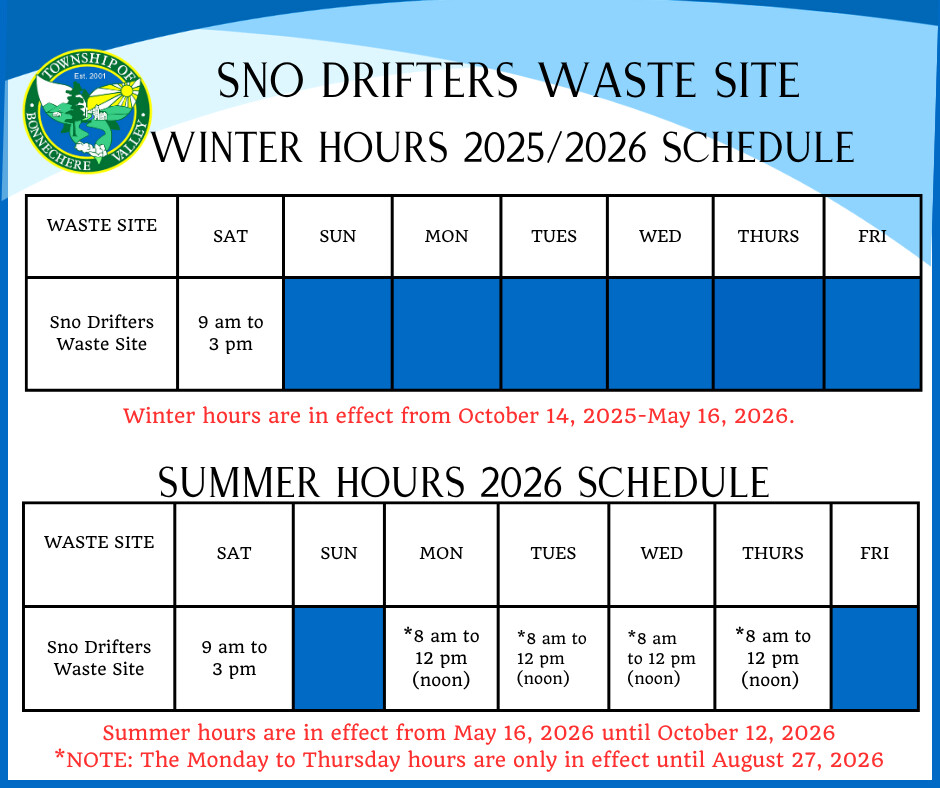 The Sno Drifters Waste Site is located at 213 Sno Drifters Road. The hours of operation vary between the Summer and Winter Hours. Please refer to the Hours of Operation schedule for days and times. The Sno Drifters Site utilizes a scale/weight system, please stop and wait for instructions from the Waste Site Attendant. The accepted method of payment at the Site is cash.