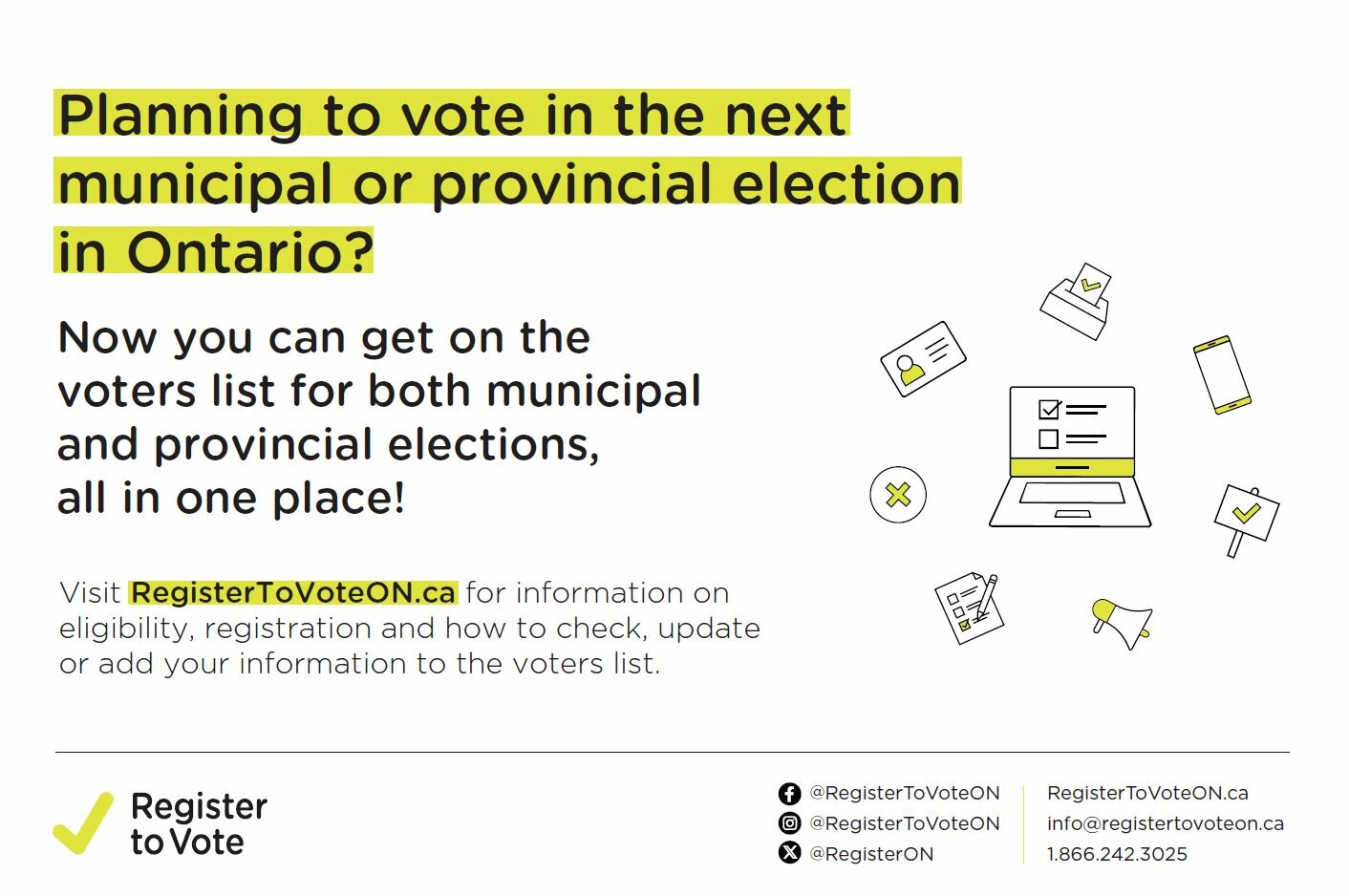 Visit www.registertovoteon.ca for information on eligibility, registration and how to check, update or add your information to the voters list.