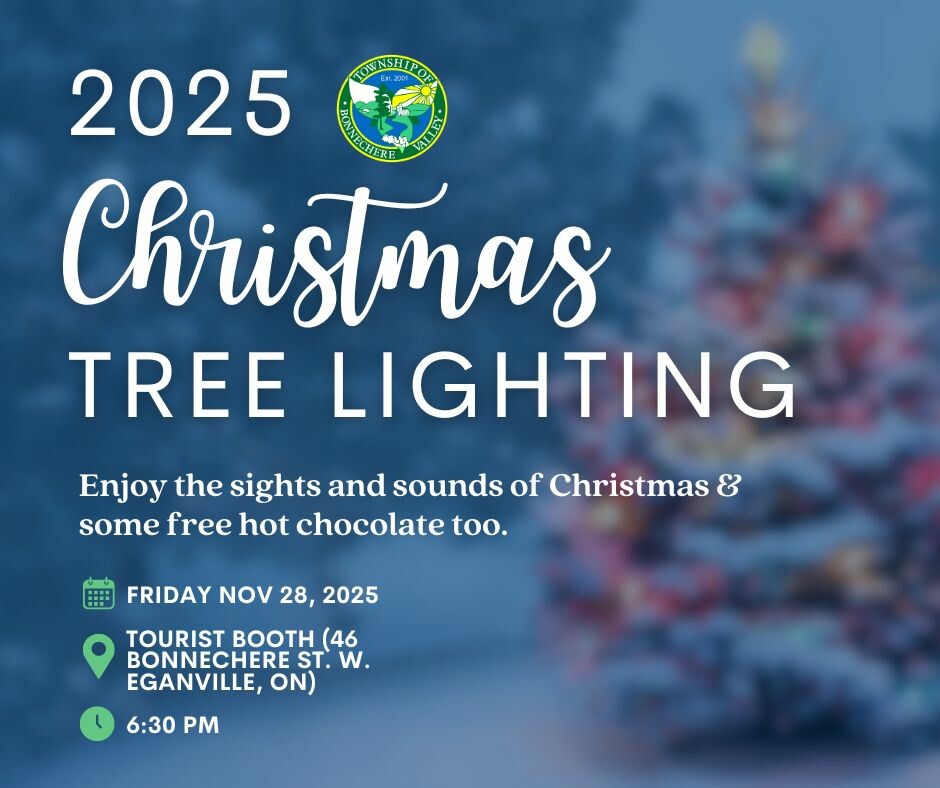 Join us for the Christmas Tree Lighting. Enjoy the sights and sounds of Christmas & some free hot chocolate too! Friday, November 28th, 2025 6:30 PM Eganville Tourist Booth, 46 Bonnechere St. W.