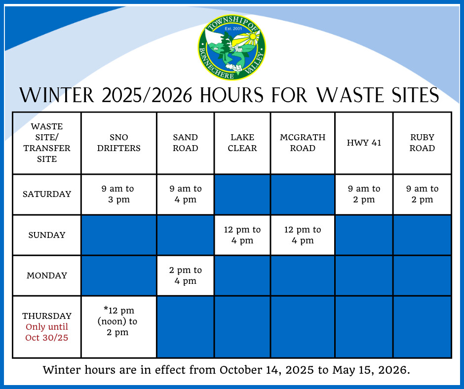 Waste Sites operating on Winter Hours beginning October 14, 2025