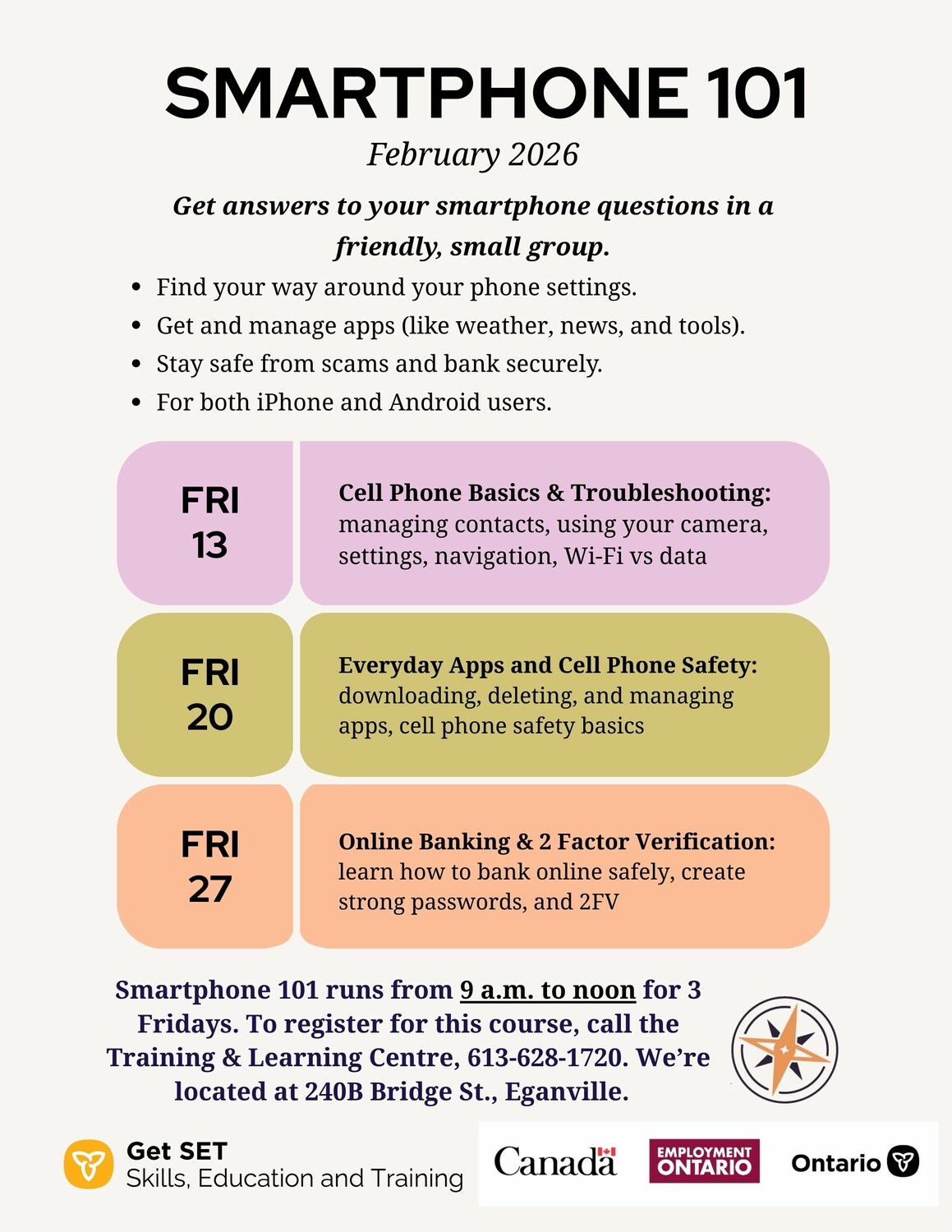 Smartphone 101 runs from 9 a.m. to noon for 3 Fridays. To register for this course, call the Training & Learning Centre, 613-628-1720. We're located at 240B Bridge St., Eganville.