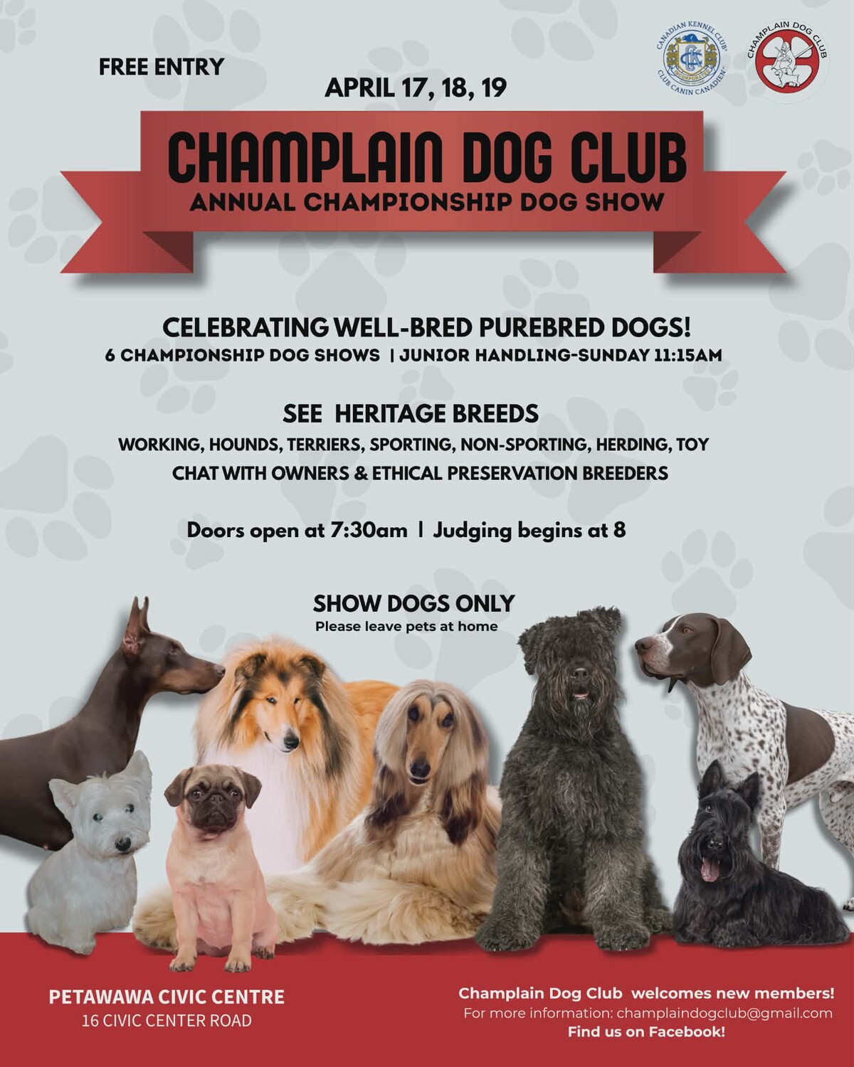The Champlain Dog Club is pleased to host it's annual Dog Show, Friday April 17 to Sunday April 19 at the Petawawa Civic Centre.